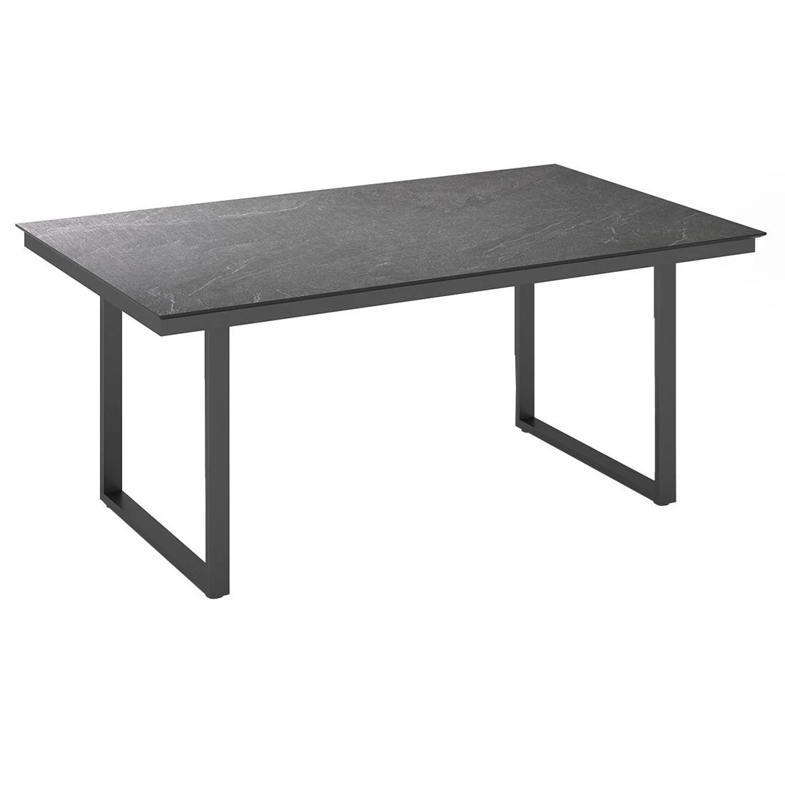 Das Gestell des eleganten Tisches ist aus Aluminium gefertigt. Das robuste Kufengestell lässt sich hervorragend mit modernen Freischwingern und anderen Kufenmöbeln kombinieren. Die schöne HPL-Tischplatte ist nicht nur ein optischer Hingucker, sondern besitzt zudem eine besonders stabile und durchaus kratzfeste Oberfläche, die sämtlichen Belastungen entgegenwirkt. Farblich ist die Platte in Jura Anthrazit gehalten. Der Gartentisch ist klassisch rechteckig gestaltet.